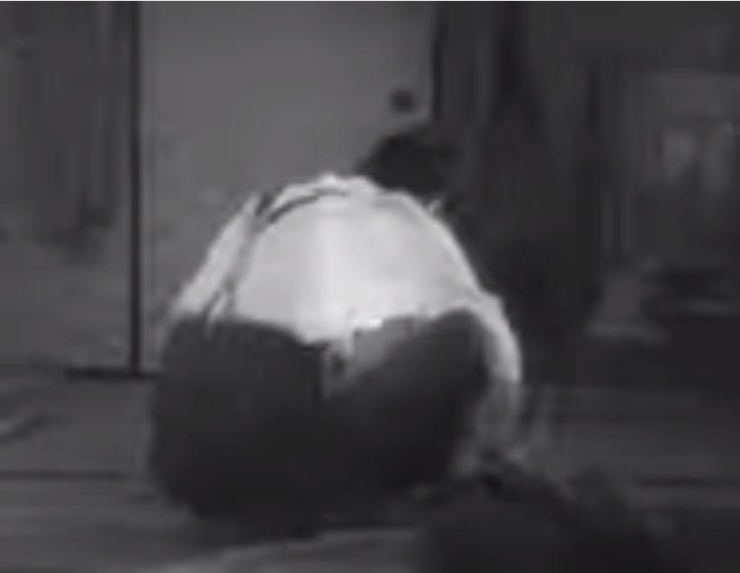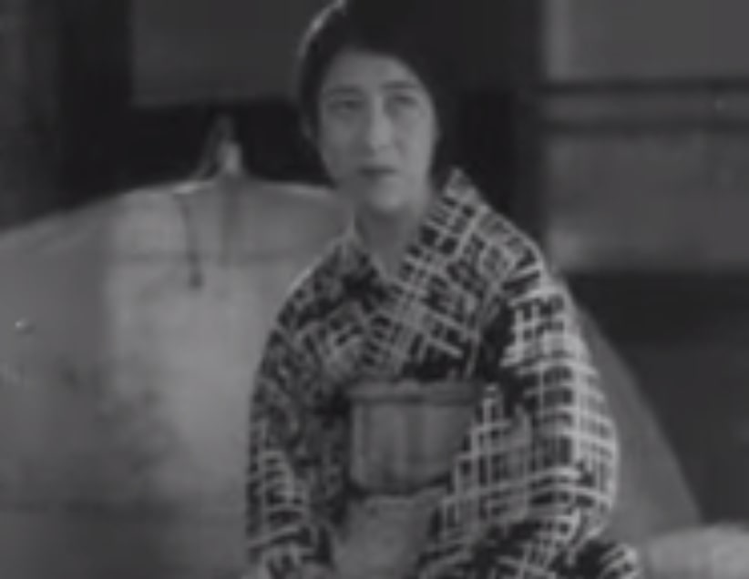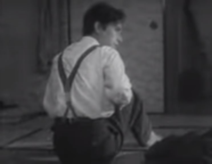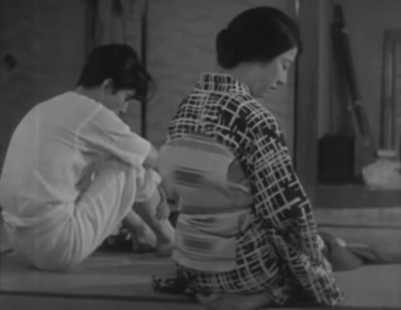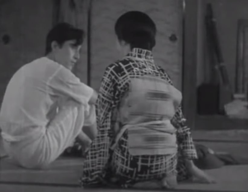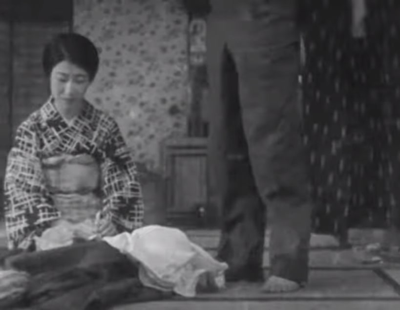 1. Incrédule devant l'attitude d'opposition manifeste de sa femme qui, assise sur ses talons, lui tourne le dos penchée sur le bébé, Okajima s'accroupit et la ventile, sa veste enserrée sous le bras gauche, dont elle aurait dû le débarrasser si l'on se fie aux codes sociaux de l'époque.