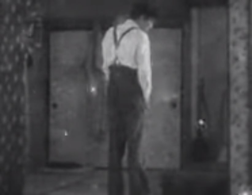 16. Champ serré taille en légère contre-plongée dudit qui tourne les talons pour disparaître par l'ouverture derrière lui.