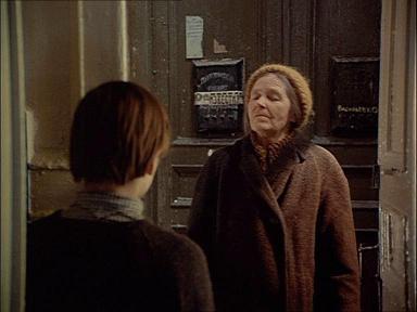 Dans notre séquence, de même qu'au tout début Maroussia repose d'abord en posture d'alerte sur la barrière, les jambes tournées vers l'intérieur. Elle est là comme un lion en cage. Elle ne cesse de sortir du champ et d'y retourner sans toujours bien savoir ce qu'elle fait, le chiot prisonnier sur le meuble en témoigne suffisamment. A la séquence 24, au beau milieu de la pièce, un lit improvisé sur un matelas où Aliocha consulte le livre volé assis sur ses talons (sur le qui-vive lui aussi), donne à penser, que trop anxieuse pour supporter seule l'attente nocturne, elle y fait aussi dormir ses enfants, de même qu'elle les colle sur le hamac auprès de la barrière. La caméra souligne ce bivouac en prenant d'abord un léger recul, puis s'avançant, jusqu'à ce que le bord inférieur du matelas coïncide avec le bord inférieur du cadre.