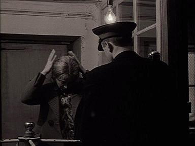 Cette imprimerie évoque en fait la violence policière et guerrière. Vêtue d'un manteau à revers de coupe militaire, Maroussia portant les mains à la tête pour se lisser les cheveux devant le gardien en casquette a l'air d'obtempérer sous la menace d'une arme. Même geste face à Liza, dont le long fume-cigarette, la veste jetée sur l'épaule, les motifs du chemisier semblables à des bretelles et le regard fixe dans le contre-jour désignent l'officier allemand conduisant un interrogatoire. Les escaliers métalliques s'enfonçant sous terre, les coursives sans fin, les portes blindées et les grossières murailles nues miment l'architecture carcérale ou militaire. Le rythme pressé des deux femmes qu'accompagne la secrétaire en sanglots, y fait résonner un pas cadencé dans un couloir conduisant à ce qui semble un lieu d'exécution. Des poteaux munis de panneaux-cibles s'y alignent, dominant un sol que l'éclairage fait paraître neigeux, comme au stand de tir de l'instruction militaire des enfants (séquence 17). La secrétaire de dos s'arrête un instant face à ce sinistre alignement, et levant le coude pour essuyer ses larmes, paraît braquer un fusil invisible sur une cible (faire ici un arrêt sur image), tandis que, pour souligner l'effet caché, un travelling avant serre sur elle jusqu'au changement de plan en coupe franche.