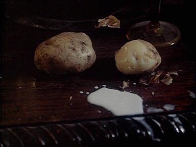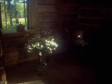 Toute trace de geste est ici trace de geste interrompu. Le vase au bouquet sec " éruptif " rappelle en le redoublant le buisson explosif logiquement visible de la fenêtre. Mais, à la séquence 31, il est posé à terre comme si on l'avait précipitamment enlevé pour mieux se pencher au dehors. Un rayon de soleil venu de la fenêtre côté Est l'embrase. Le moulin à café s'y substituant sur l'appui de la fenêtre de pignon, indique que Maroussia ne peut quitter son poste même le matin pour préparer le café. Le chiot sur la commode est trop petit pour y avoir grimpé seul. Elle le tenait donc contre elle, puis sollicitée par autre chose, l'a planté là.