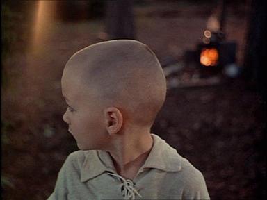 La ressemblance entre les deux fillettes est si parfaite qu'on peut se demander si le plan d'archive n'est pas fabriqué avec le concours de la même jeune actrice, puis inséré dans la séquence. La même expression se peint sur les deux visages identiquement cadrés de face. La capote est le lien métonymique de l'implication militaire des deux séquences. Seule l'orientation des corps opposés en miroir diffère, tout en accentuant l'effet de comparaison. Ce que n'exprime pas le tragique double de la situation de Marina et de son frère dans un monde en guerre et séparés de leur père, émane de cette anticipation narrative d'une fillette étrangère à leur époque et à leur pays.