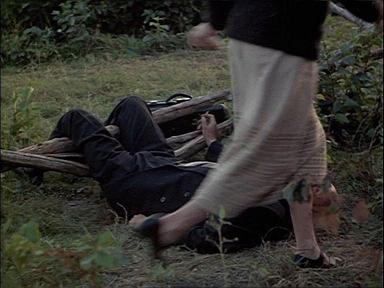 Un peu plus tard, le "crac!" de la barrière accompagné d'un "hou !" masculin avec deux très discrets "hum !" féminins, indique l'acte consommé. Elle se lève bien vite, époussetant ses fesses puis, pour sortir droite cadre, enjambe quasiment la face du satyre en lui demandant ce qui le réjouit tant. Il tourne un peu la tête attentivement vers la caméra qui s'abaisse sur lui avec sollicitude, comme si c'était elle qui se penchait affectueusement. Soudain le regard de l'homme devient fixe, tandis que bourdonne une grosse mouche, indice d'émanations d'origine sexuelle.