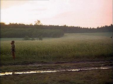 The motif of the train is a central theme as the metonomy of (symbolic processes) the abandonment. It closes the film, as well, under the form of a double rectilinear rut filled with a metallic looking water and crossing the field parallel to the wide sides of the frame and when the young Alyosha lets out a war cry similar to the mechanical cry of a train. Looking closely, you notice Marusya, herself imitating the train, puffing some smoke associated with the two logs forming the fence, parallel like rails. The wait for her husband, from which she cannot seem to break herself, is in fact her destiny. In the dacha everything must obey this imperative where each suffers.